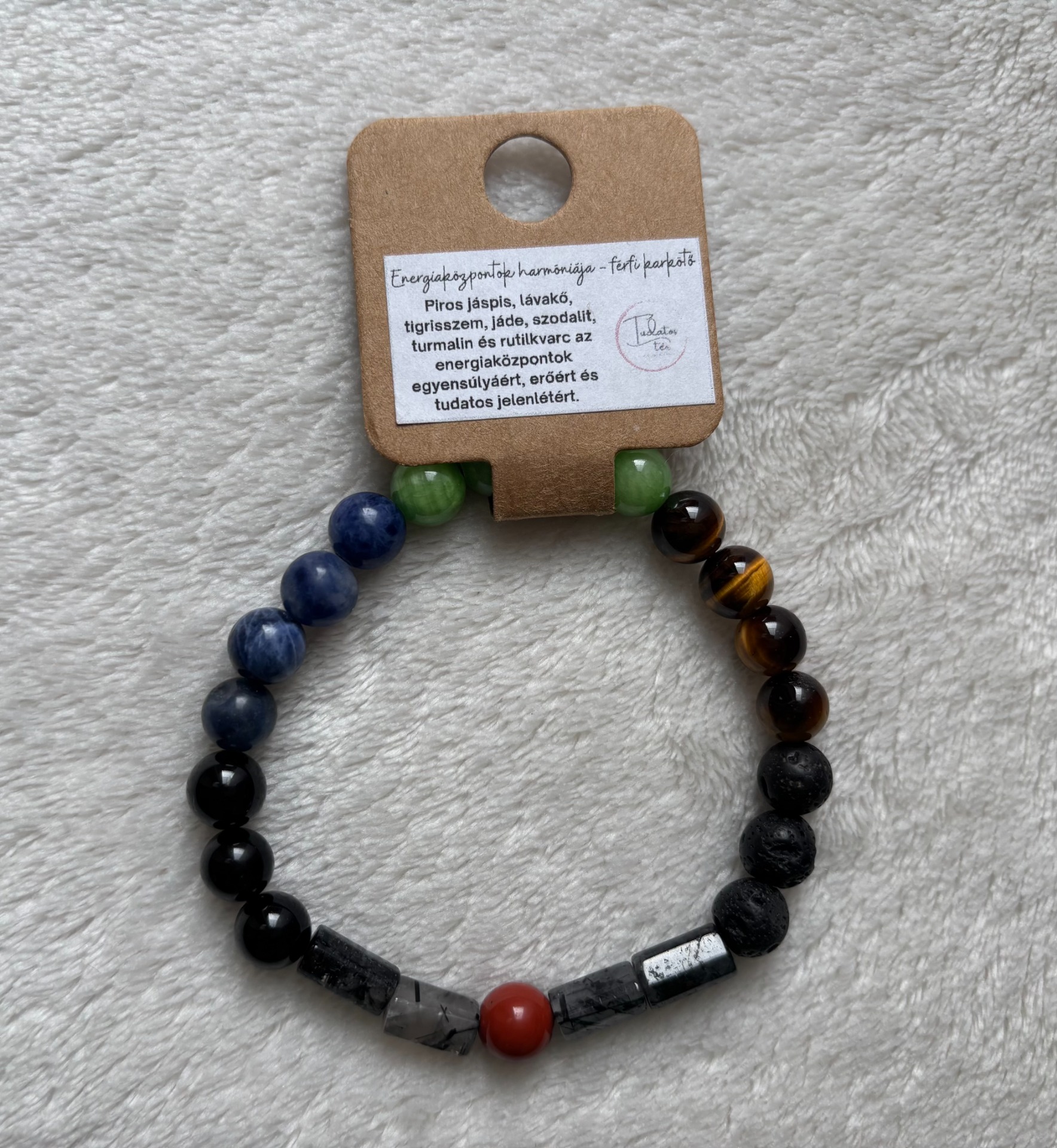 Piros jáspis, lávakő, tigrisszem, jáde, szodalit, turmalin és rutilkvarc az energiaközpontok egyensúlyáért, az erőért és a tudatos jelenlétért.