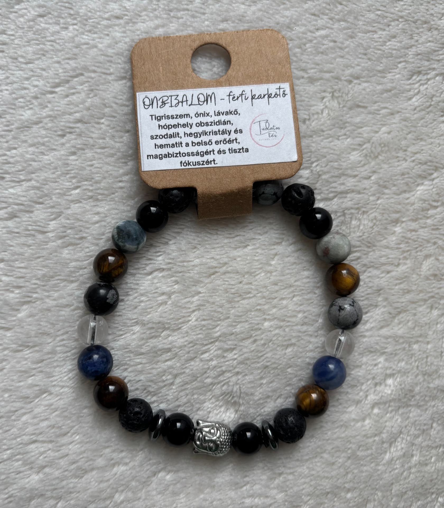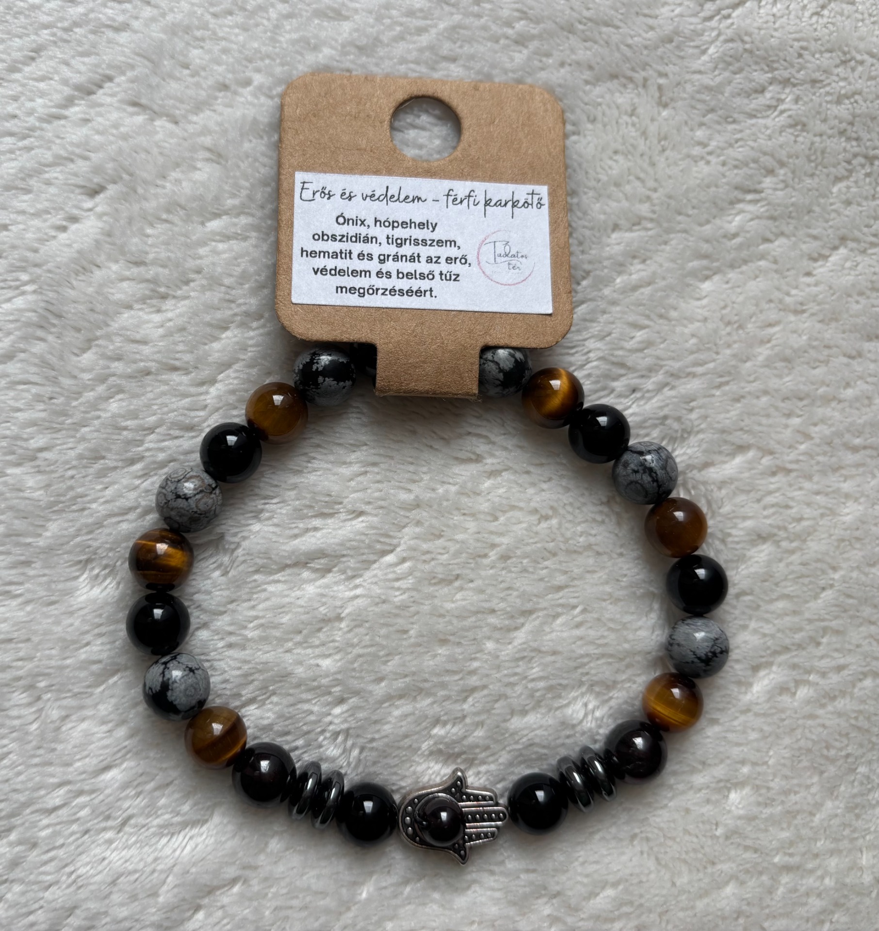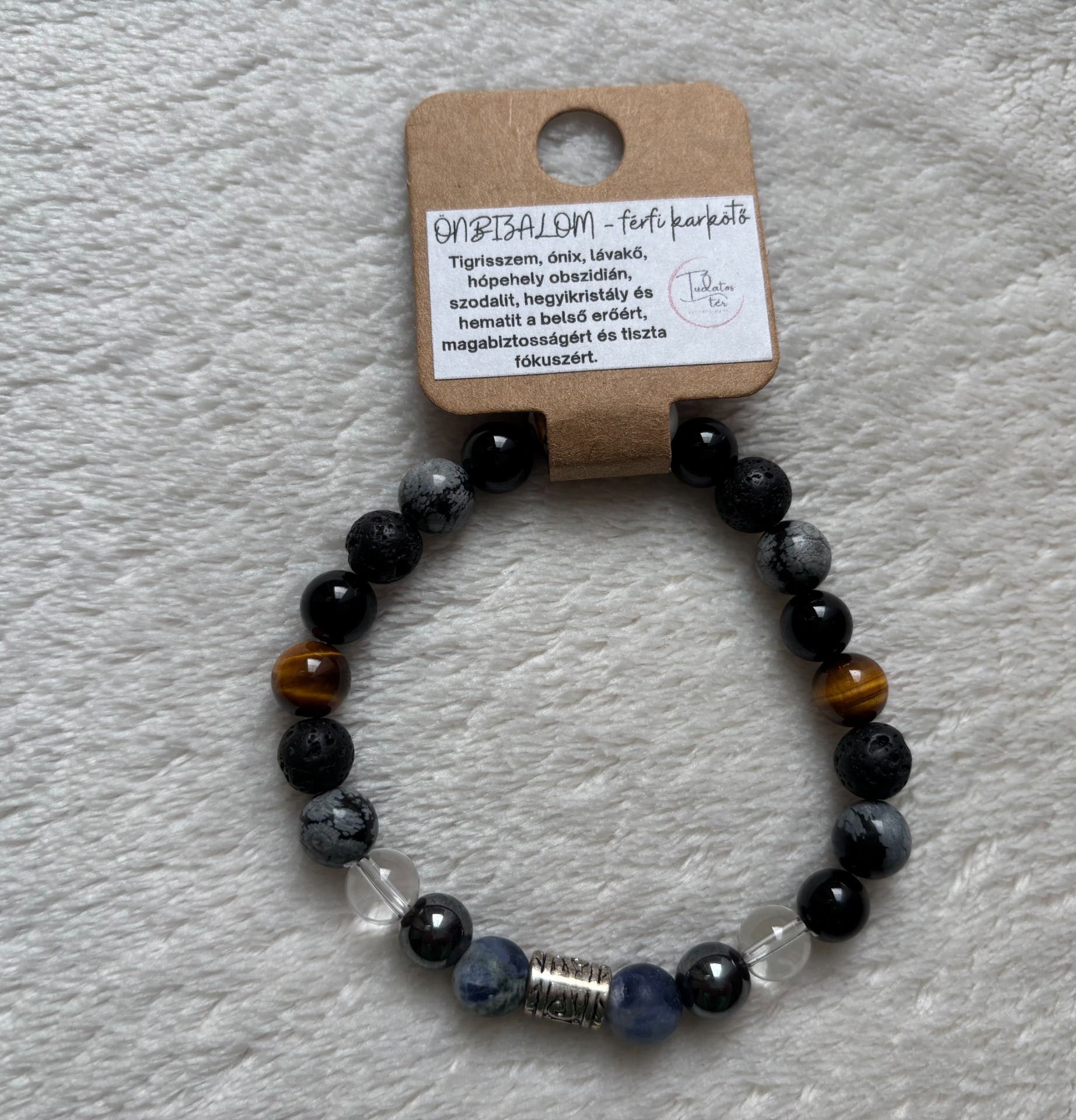 Tigrisszem, ónix, lávakő, hópehely obszidián, szodalit, hegyikristály és hematit a belső erőért, a magabiztosságért és a tiszta fókuszért.