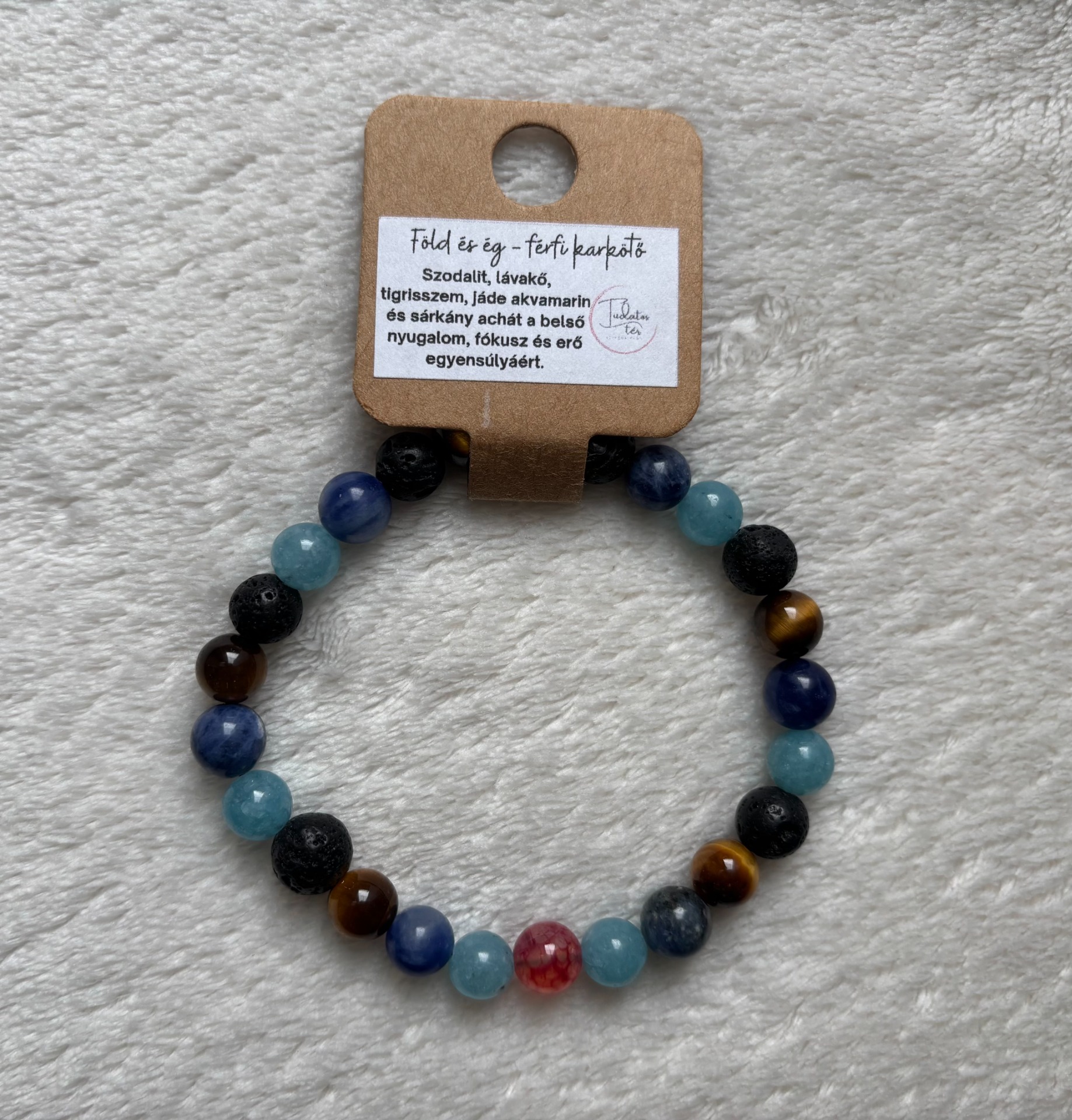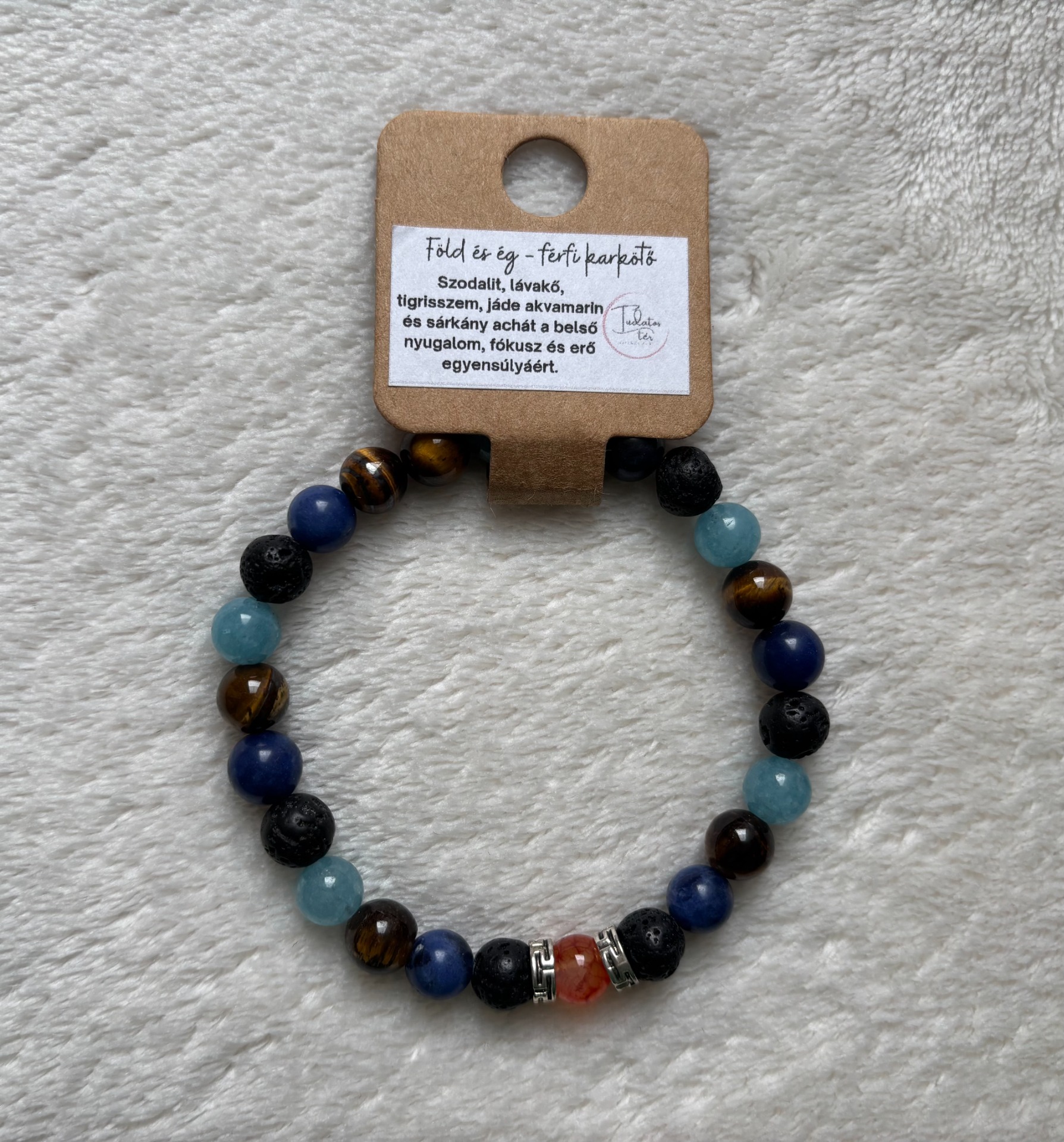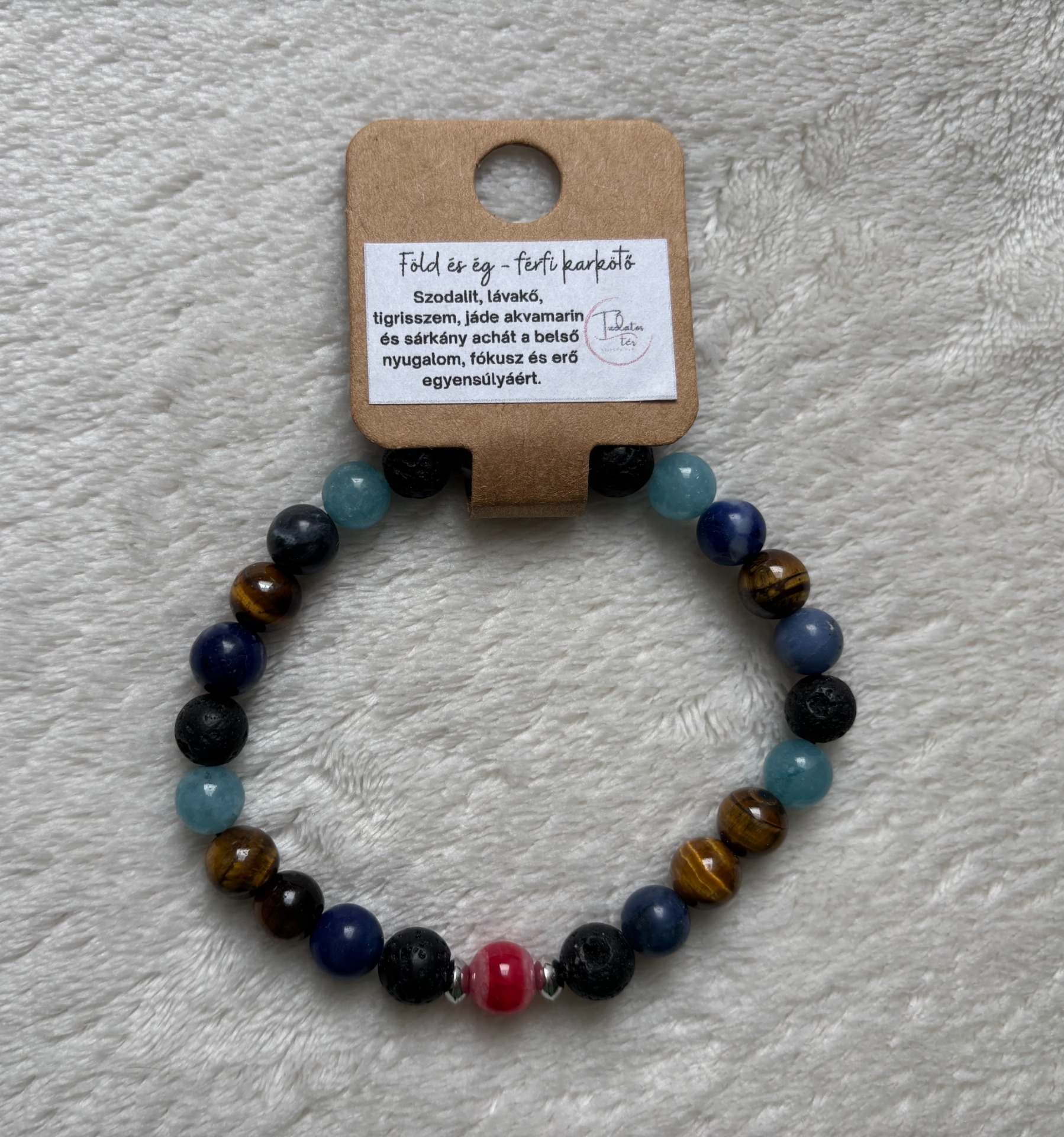 Szodalit, lávakő, tigrisszem, jáde akvamarin és sárkány achát a belső nyugalom, fókusz és erő egyensúlyáért.